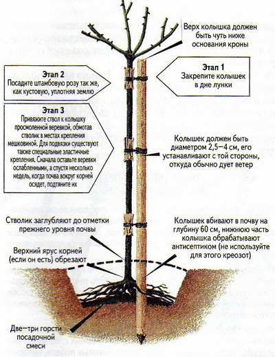 Выбор сортов и высота штамба взаимосвязаны: на самые высокие штамбы, до 1,5 м прививают плетистые розы. На штамбы средней высоты — 1,2 м — чайно-гибридные, грандифлора, флорибунда, ремонтантные, чтобы крона была на уровне глаз. На низкие штамбовые подвои — 0,6-0,8 м — прививают почвопокровные сорта роз.